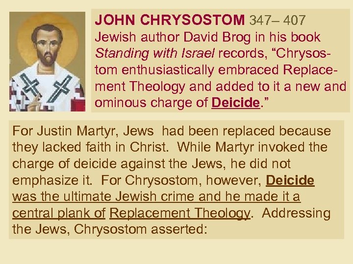 JOHN CHRYSOSTOM 347– 407 Jewish author David Brog in his book Standing with Israel records, “Chrysostom enthusiastically embraced Replacement Theology and added to it a new and ominous charge of Deicide. ” For Justin Martyr, Jews had been replaced because they lacked faith in Christ. While Martyr invoked the charge of deicide against the Jews, he did not emphasize it. For Chrysostom, however, Deicide was the ultimate Jewish crime and he made it a central plank of Replacement Theology. Addressing the Jews, Chrysostom asserted: