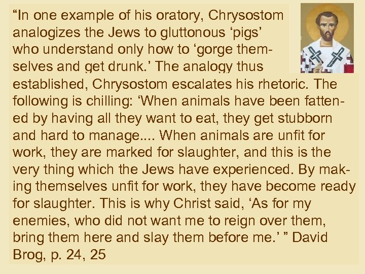 “In one example of his oratory, Chrysostom analogizes the Jews to gluttonous ‘pigs’ who understand only how to ‘gorge themselves and get drunk. ’ The analogy thus established, Chrysostom escalates his rhetoric. The following is chilling: ‘When animals have been fattened by having all they want to eat, they get stubborn and hard to manage. . When animals are unfit for work, they are marked for slaughter, and this is the very thing which the Jews have experienced. By making themselves unfit for work, they have become ready for slaughter. This is why Christ said, ‘As for my enemies, who did not want me to reign over them, bring them here and slay them before me. ’ ” David Brog, p. 24, 25