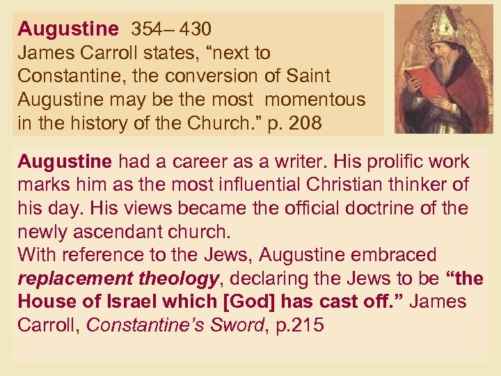 Augustine 354– 430 James Carroll states, “next to Constantine, the conversion of Saint Augustine may be the most momentous in the history of the Church. ” p. 208 Augustine had a career as a writer. His prolific work marks him as the most influential Christian thinker of his day. His views became the official doctrine of the newly ascendant church. With reference to the Jews, Augustine embraced replacement theology, declaring the Jews to be “the House of Israel which [God] has cast off. ” James Carroll, Constantine’s Sword, p. 215