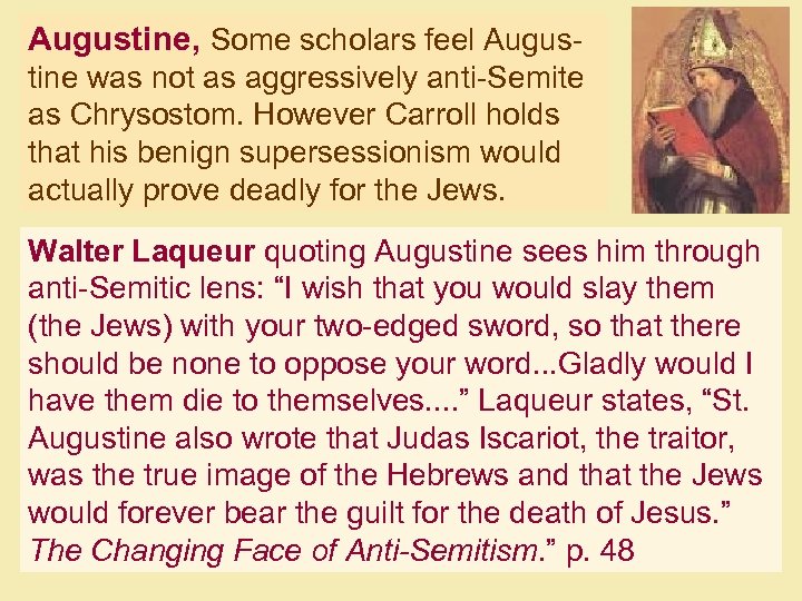 Augustine, Some scholars feel Augustine was not as aggressively anti-Semite as Chrysostom. However Carroll holds that his benign supersessionism would actually prove deadly for the Jews. Walter Laqueur quoting Augustine sees him through anti-Semitic lens: “I wish that you would slay them (the Jews) with your two-edged sword, so that there should be none to oppose your word. . . Gladly would I have them die to themselves. . ” Laqueur states, “St. Augustine also wrote that Judas Iscariot, the traitor, was the true image of the Hebrews and that the Jews would forever bear the guilt for the death of Jesus. ” The Changing Face of Anti-Semitism. ” p. 48