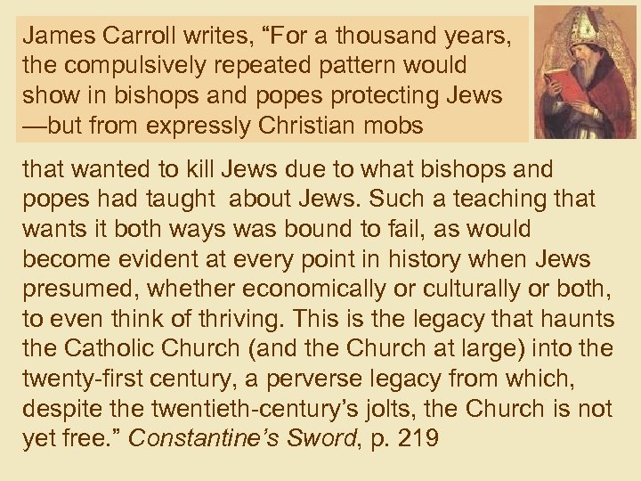 James Carroll writes, “For a thousand years, the compulsively repeated pattern would show in bishops and popes protecting Jews —but from expressly Christian mobs that wanted to kill Jews due to what bishops and popes had taught about Jews. Such a teaching that wants it both ways was bound to fail, as would become evident at every point in history when Jews presumed, whether economically or culturally or both, to even think of thriving. This is the legacy that haunts the Catholic Church (and the Church at large) into the twenty-first century, a perverse legacy from which, despite the twentieth-century’s jolts, the Church is not yet free. ” Constantine’s Sword, p. 219