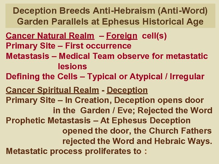 Deception Breeds Anti-Hebraism (Anti-Word) Garden Parallels at Ephesus Historical Age Cancer Natural Realm – Foreign cell(s) Primary Site – First occurrence Metastasis – Medical Team observe for metastatic lesions Defining the Cells – Typical or Atypical / Irregular Cancer Spiritual Realm - Deception Primary Site – In Creation, Deception opens door in the Garden / Eve; Rejected the Word Prophetic Metastasis – At Ephesus Deception opened the door, the Church Fathers rejected the Word and Hebraic Ways. Metastatic process proliferates to :