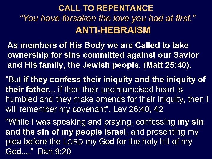 CALL TO REPENTANCE “You have forsaken the love you had at first. ” ANTI-HEBRAISM As members of His Body we are Called to take ownership for sins committed against our Savior and His family, the Jewish people. (Matt 25: 40). "But if they confess their iniquity and the iniquity of their father. . . if then their uncircumcised heart is humbled and they make amends for their iniquity, then I will remember my covenant”. Lev 26: 40, 42 “While I was speaking and praying, confessing my sin and the sin of my people Israel, and presenting my plea before the LORD my God for the holy hill of my God. . ” Dan 9: 20