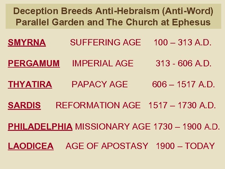 Deception Breeds Anti-Hebraism (Anti-Word) Parallel Garden and The Church at Ephesus SMYRNA SUFFERING AGE 100 – 313 A. D. PERGAMUM IMPERIAL AGE 313 - 606 A. D. THYATIRA PAPACY AGE SARDIS 606 – 1517 A. D. REFORMATION AGE 1517 – 1730 A. D. PHILADELPHIA MISSIONARY AGE 1730 – 1900 A. D. LAODICEA AGE OF APOSTASY 1900 – TODAY