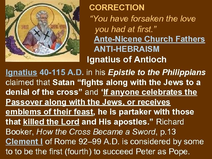 CORRECTION “You have forsaken the love you had at first. ” Ante-Nicene Church Fathers ANTI-HEBRAISM Ignatius of Antioch Ignatius 40 -115 A. D. in his Epistle to the Philippians claimed that Satan “fights along with the Jews to a denial of the cross” and ‘If anyone celebrates the Passover along with the Jews, or receives emblems of their feast, he is partaker with those that killed the Lord and His apostles. ” Richard Booker, How the Cross Became a Sword, p. 13 Clement I of Rome 92– 99 A. D. is considered by some to to be the first (fourth) to succeed Peter as Pope.
