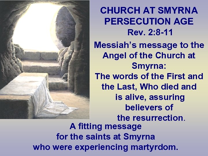 CHURCH AT SMYRNA PERSECUTION AGE Rev. 2: 8 -11 Messiah’s message to the Angel of the Church at Smyrna: The words of the First and the Last, Who died and is alive, assuring believers of the resurrection. A fitting message for the saints at Smyrna who were experiencing martyrdom.
