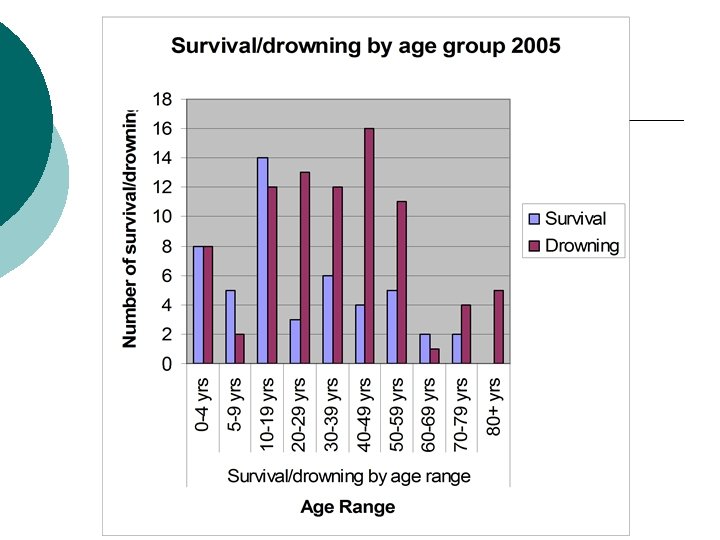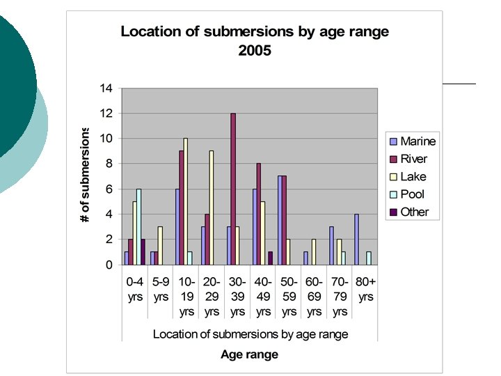 Overview ¡ ¡ 146 reports reviewed Some out of state [6] 1 Arizona, Wa residents, 5 Oregon border areas to WA 13 did not have age information on them Key: l l Survival - checked, drowning - blank Location: 1 = marine; 2 = river, creek; 3 = lake, pond; 4 = pool; 5 = other