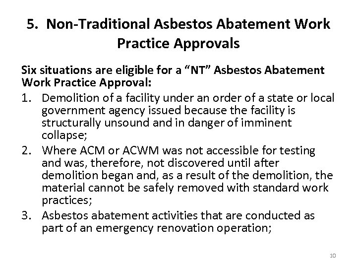 5. Non-Traditional Asbestos Abatement Work Practice Approvals Six situations are eligible for a “NT” Asbestos Abatement Work Practice Approval: 1. Demolition of a facility under an order of a state or local government agency issued because the facility is structurally unsound and in danger of imminent collapse; 2. Where ACM or ACWM was not accessible for testing and was, therefore, not discovered until after demolition began and, as a result of the demolition, the material cannot be safely removed with standard work practices; 3. Asbestos abatement activities that are conducted as part of an emergency renovation operation; 10