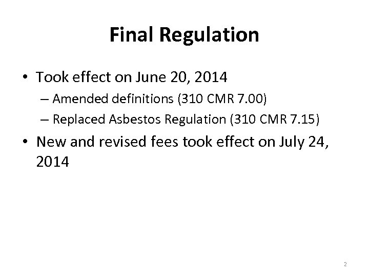 Final Regulation • Took effect on June 20, 2014 – Amended definitions (310 CMR 7. 00) – Replaced Asbestos Regulation (310 CMR 7. 15) • New and revised fees took effect on July 24, 2014 2