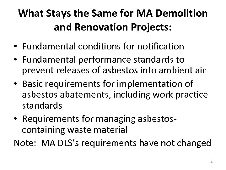 Basic Program Structure Stays the Same: • Mass. DEP’s authority to prevent releases of asbestos to ambient air, and to protect public health, safety, and the environment: – MA Clean Air Act (M. G. L. c. 111, sections 142 A-142 O) – Delegation from U. S. Environmental Protection Agency under the Asbestos NESHAP (1985 et. seq. ) • MA DLS authority to protect worker and public safety: – M. G. L. c. 149, sections 6 A – 6 G – 453 CMR 6. 00 • State Sanitary Code also regulates asbestos in dwellings – 105 CMR 410. 000 – Implemented by Boards of Health 3