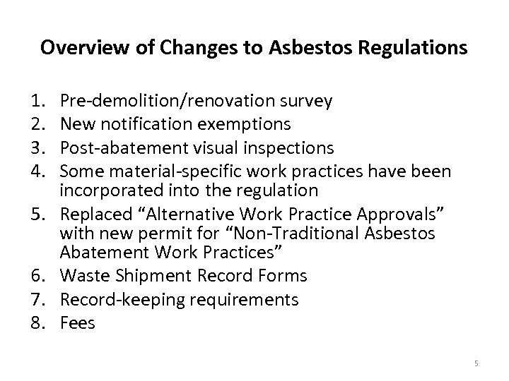 What Stays the Same for MA Demolition and Renovation Projects: • Fundamental conditions for notification • Fundamental performance standards to prevent releases of asbestos into ambient air • Basic requirements for implementation of asbestos abatements, including work practice standards • Requirements for managing asbestoscontaining waste material Note: MA DLS’s requirements have not changed 4