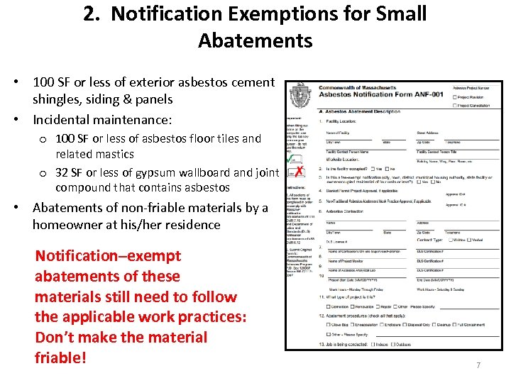 1. Pre-Demo/Reno Survey • Done before demolition/renovation of any facility or facility component that contains suspect ACM. • Engage a DLS-certified Asbestos Inspector to conduct thorough inspection – Identify all material containing asbestos in any amount (including <1%) – Select appropriate class of DLS-certified laboratory to assure use of approved analytical methods. • Keep survey report for at least two years 6