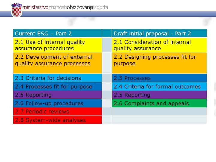 2. 2 Designing processes fit for purpose (2. 2 Development of external quality assurance processes) The aims and objectives of quality assurance processes should be determined before the processes themselves are developed, by all those responsible (including higher education institutions) and should be published with a description of the procedures to be used. All external quality assurance processes should be defined and designed specifically to ensure their fitness to achieve the aims and objectives set for them, while taking into account relevant regulations. Stakeholders should be involved in the design and continuous improvement of processes.