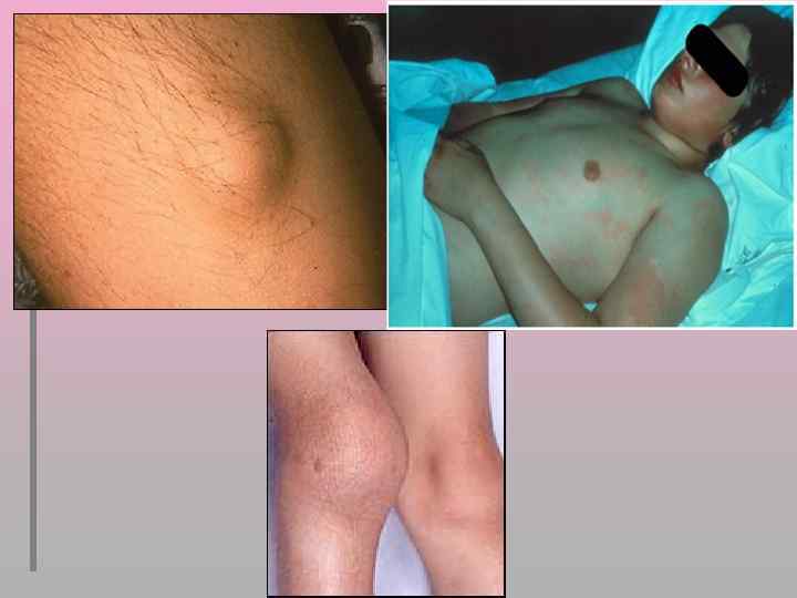 Дифференциальный диагноз кольцевидной эритемы Нодозная эритема • плотные воспалительные узлы полушаровидные • болезненные • кожа над узлами ярко-розовая, а затем синюшная • Не сопровождается поражением сердца. Клещевая мигрирующая эритема • ранняя стадия Лайм-боррелиоза • больших размеров • часто в области головы и лица • сопровождается жжением, зудом