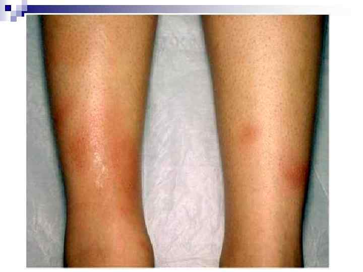 Ревматический полиартрит (60 -100% случаев) n n n n Мигрирующий полиартрит преимущественно крупных и средних суставов (коленных, голеностопных, реже - локтевых, плечевых, лучезапястных). Сочетается с кардитом. Преобладающая форма поражения в последние годы - преходящий олигоартрит и – реже - моноартрит. Отличается быстрой регрессией воспалительных изменений в суставах под влиянием противовоспалительной терапии. В отдельных случаях возможны атипичные проявления суставного синдрома - поражение мелких суставов кистей и стоп, асимптомные сакроилеиты, чаще у мужчин молодого возраста. В 10 -15% случаев выявляется только артралгия (мигрирующая боль в крупных суставах различной интенсивности), которая в отличие от артрита не сопровождается болезненностью при пальпации и другими симптомами воспаления. По сравнению с мигрирующим полиартритом она имеет меньшую специфичность для ОРЛ и поэтому относится к малым диагностическим критериям заболевания