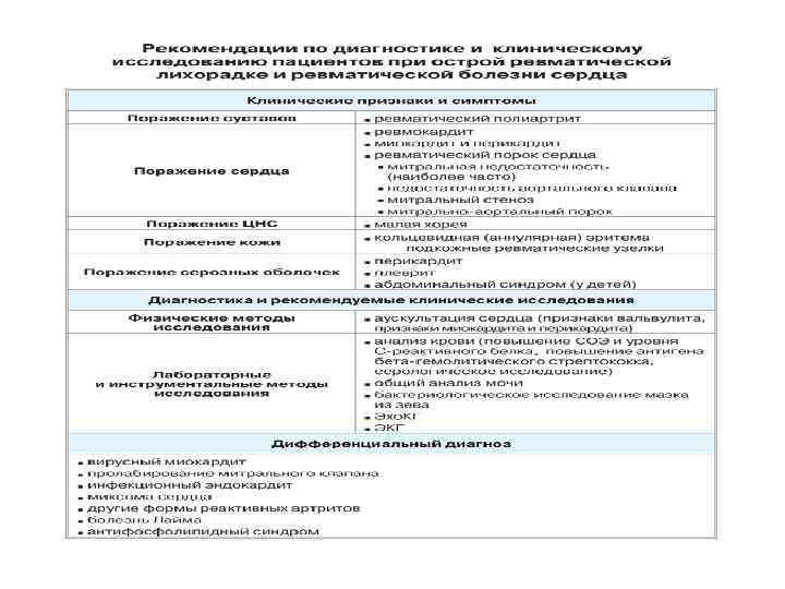 Диагностические критерии ревматизма Киселя - Джонса (ВОЗ, 1992) Большие критерии • Кардит • Мигрирующий полиартрит • Хорея Сиденгама (малая хорея) • Кольцевидная эритема • Подкожные ревматические узелки Малые критерии • 1. Клинические: боли в суставах, лихорадка • 2. Лабораторные: • Повышение содержания острофазовых реактантов: СОЭ, Среактивного белка, Удлинение интервала PR на ЭКГ • Подтверждение предшествующей А-стрептококковой инфекции • Позитивная А-стрептококковая культура, выделенная из зева, или положительный результат быстрого определения Астрептококкового антигена • Повышенные или повышающиеся титры стрептококковых антител