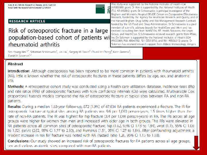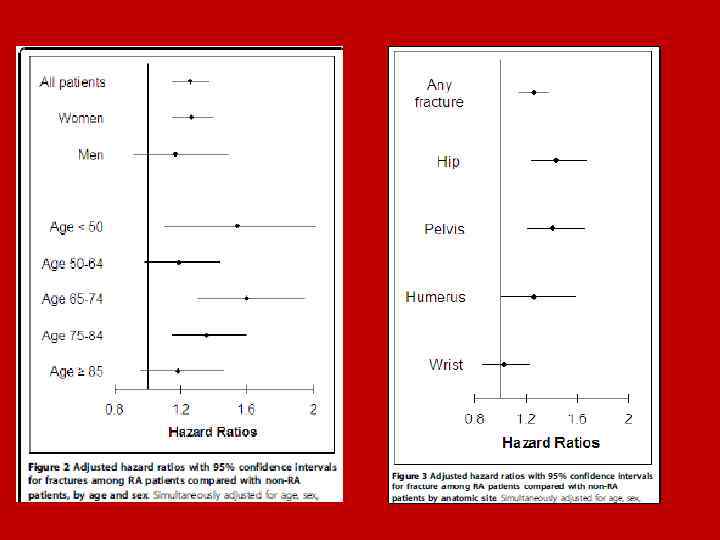 • Наиболее драматическим является перелом проксимального отдела бедра (шейки бедра), смертность после которого в течение первого года может достигать 35%. • По данным S. Y. Kim и соавт. которые около 2 лет наблюдали за 47 034 пациентами с РА и 235 170 здоровыми лицами, риск перелома бедренной кости у больных РА составил 1, 62 (95% ДИ 1, 43– 1, 84). •