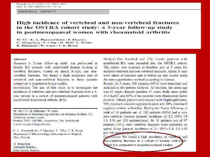 • По данным Ю. В. Барышевой и О. Б. Ершовой , распространенность переломов позвонков у женщин в постменопаузе, больных РА (n=134, средний возраст 59, 4+1, 0 года), составляет 14, 9%, в то время как в популяции г. Ярославля – 2, 9%. (1) • Анализируя частоту ОП и остеопоротических переломов у 70 женщин, заболевших РА в пожилом возрасте (средний возраст 66, 9+5, 9 года), К. А. Касумова и А. М. Сатыбалдыев (НИИР РАМН) установили, что частота переломов позвонков составляет 43%, в то время как в популяции Москвы – 11, 8%. • 1. Барышева Ю. В. , Ершова О. Б. , Белосельский Н. Н. Факторы риска остеопороза у женщин с ревматоидным артритом в постменопаузе. Науч-практич ревматол 2003; 3: 27– 31. • 2. Касумова К. А. , Сатыбалдыев А. М. , Иванова М. М. , Смирнов А. В. Остеопороз и его осложнения у больных ревматоидным артритом, начавшимся в пожилом возрасте. Тезисы Конгресса