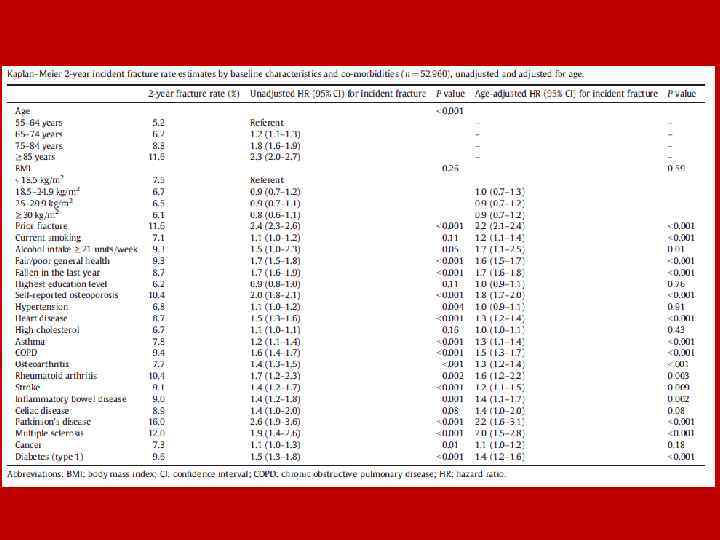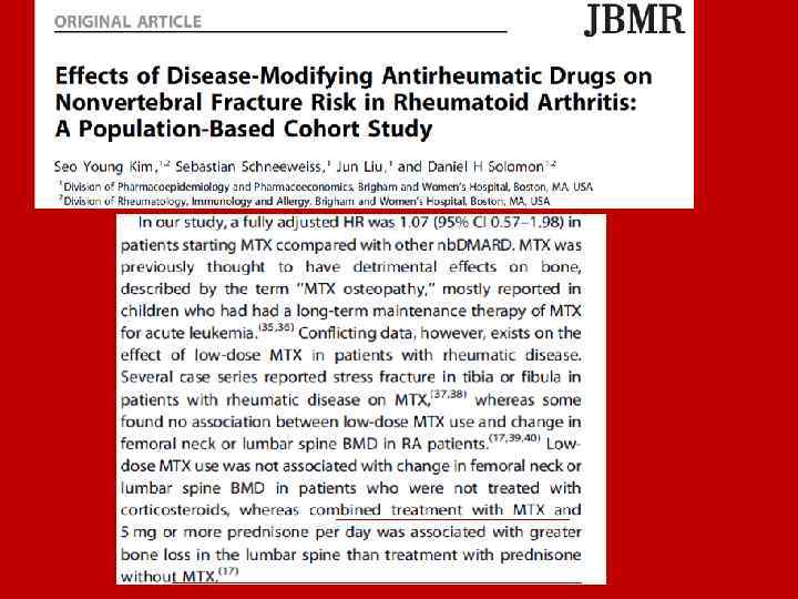 Факторы риска, ассоциированные с возникновением переломов бедра у японских пациентов с РА: проспекивное когортное исследование • 9 720 пациентов с РА (82, 1% женщин, средний возраст 55, 7 лет) • Период наблюдения 2000 – 2010 гг. • Высокий уровень функциональных ограничений по данным оценки состояния здоровья на основании опросника состояния здоровья (HAQ), пожилой возраст, риск падений и низкий ИМТ являются факторами, способствующими возникновению переломов бедра у пациентов с РА. • Среди шкал опросника состояния здоровья наибольшую корреляцию с возникновением переломов бедра имели функциональные ограничения, связанные с вставанием и гигиеническими процедурами.