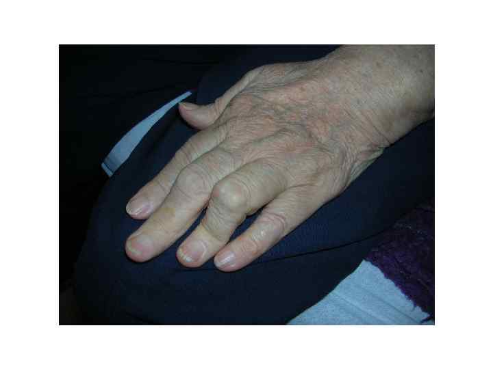 Внесуставные проявления ревматоидного артрита • Ревматоидные узелки – безболезненные округлые образования до 1, 5 -4 см в диаметре, подвижные, иногда спаянные с апоневрозом или подлежащей костью, располагаются чаще на разгибательной поверхности предплечья, суставов пальцев кистей, локтевых суставов. Могут быть в области крестца, затылка, голосовых связок, в миокарде, на клапанных структурах сердца, в легких и ЦНС. Появляются внезапно во время обострения, во время ремиссии могут полностью исчезать.