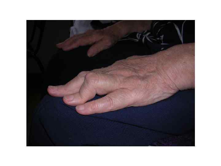 Внесуставные проявления ревматоидного артрита • Скелетные мышцы – миалгии, активный миозит с очагами некроза и атрофия. Сочетание атрофии межкостных мышц, мышц тенора и гипотенора с припухлостью пястно-фаланговых, проксимальных межфаланговых суставов, суставов запястья характеризуется как «ревматоидная кисть» • Кожа – бледная, сухая, ладони и подошвы ярко-розовые или имеют цианотичный оттенок (капиллярит). Подкожные кровоизлияния (экхимозы) - результат васкулита. Мелкоочаговый некроз мягких тканей под ногтевыми пластинками (дигитальный артериит), livedo reticularis. Истончение, ломкость, продольная исчерченность ногтей.