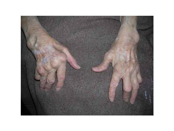 Поражение суставов при ревматоидном артрите • Локтевой сустав – ограничение сгибания и разгибания, ущемление локтевого нерва с парестезией • Плечевой сустав – ограничение подвижности, атрофия мышц, слабость околосуставной сумки и подвывих головки плечевой кости, разрыв сухожилия • Суставы стоп – деформация стопы с опусканием переднего свода стопы, формирование hallus valgus, «натоптыши» и некрозы в области головок плюсневых костей от сдавления. Воспаление сухожилий стопы может привести к сдавлению подошвенных нервов и развитию синдрома предплюсневого канала с болями и парестезиями.