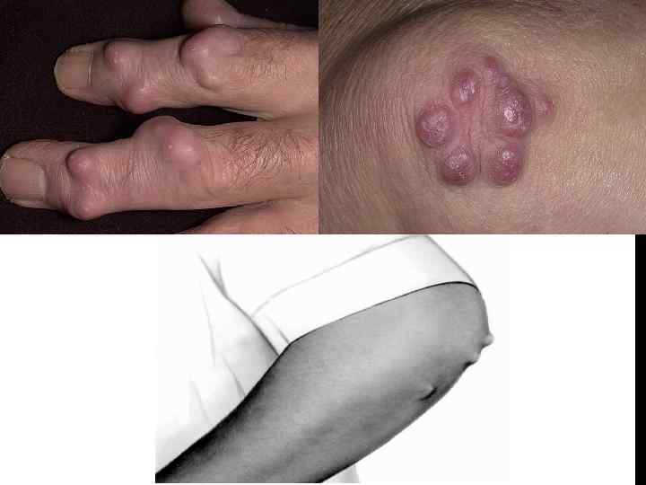 ВНЕСУСТАВНЫЕ (СИСТЕМНЫЕ) ПРОЯВЛЕНИЯ. I. Ревматоидные узелки считают наиболее распространным внесуставным проявлением РА и наблюдаются у 20 25% больных. Эти плотные подкожные образования в типичных случаях находят в местах повторяющейся травматизации. Чаще всего узелки располагаются в области лок тевого сустава, ахиллова сухожилия, на разгибательной по верхности предплечья и на затылке. Они могут иметь разные размеры и плотность. Обычно узелки не беспокоят больно го, однако травмы и инфекции могут приводить к их изъязвлению. Их обнаруживают почти у всех больных, сыворотка которых содержит ревматоидный фактор. Ревматоидные узелки не примыкают к глубинным слоям дермы, безболезненные, подвижные, иногда спаянные с апоневрозом или костью. Их необходимо дифференцировать от подагрических тофусов, периостных узелков при деформирующем остеоартрозе, ксантоматозных узелков. Их размер со временем меняется, в период ремиссии они могут полностью исчезать.