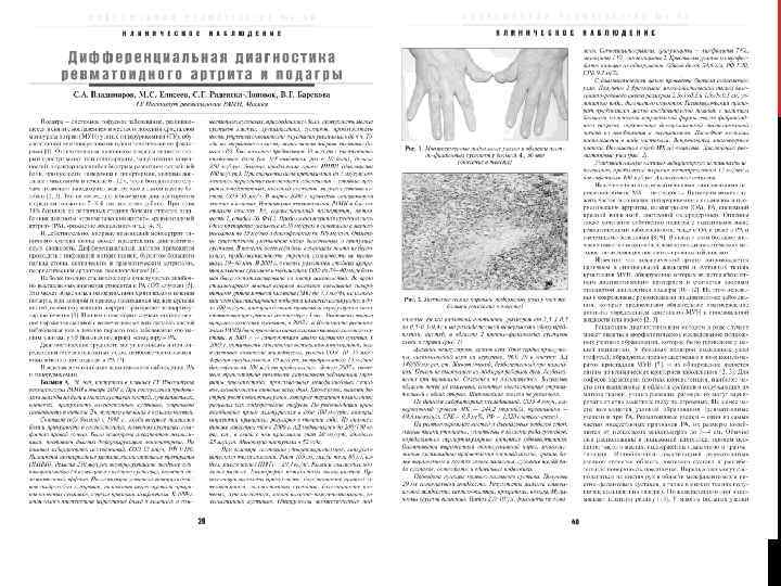 ДИФФЕРЕНЦИАЛЬНАЯ ДИАГНОСТИКА. Вирусные инфекции (краснуха, гепатит В, парвовирусная инфекция) идентифицируют по кожной сыпи, серологическим маркерам и поражениям внутренних органов. Подострый бактериальный эндокардит. При онкологических заболеваниях могут отмечаться дли тельные боли в костях, пальцы в виде барабанных палочек, периос тит, маскирующийся под полиартрит (гипертрофическая остеоартропатия) и паранеопластическая полиартропатия. Саркоидоз. Это заболевание – при котором рентгенологически выявляется аденопатия средостения и узловатая эритема, особенно при вовлечении суставов. Для амилоидоза характерна положительная окраска отло жений амилоида Конго красным в типичных органах, подкожных тка нях и суставах. РА также необходимо дифференцировать с туберкулезным артритом и псевдоподагрой (хондрокальциноз). журнал «Научно – практическая ревматология» и «Современная ревматол