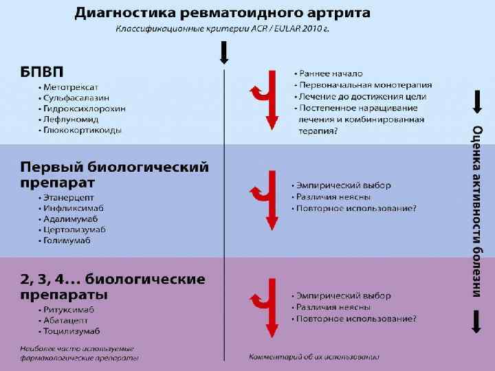 Метотрексат (МТ) является не только наиболее изученным БПВП, но и важным компонентом большинства успешных комбинаций препаратов. Все имеющиеся данные указывают на то, что ингибиторы ФНО «работали» лучше, когда использовались совместно с МТ. Поэтому МТ должен быть препаратом выбора, если только к нему нет противопоказаний. В этих случаях обоснованными вариантами выбора являются сульфасалазин или лефлуномид. Вопрос о том, должны ли к первоначальной терапии добавляться глюкокортикоиды, остается спорным, хотя в недавно опубликованных рекомендациях указывается на целесообразность их использования внутрь или парентерально. http: //meteopathy. ru/zdorovye-i-bolezn/sovremennye-podxody-k-farmakoterapiirevmatoidnogo-artrita/