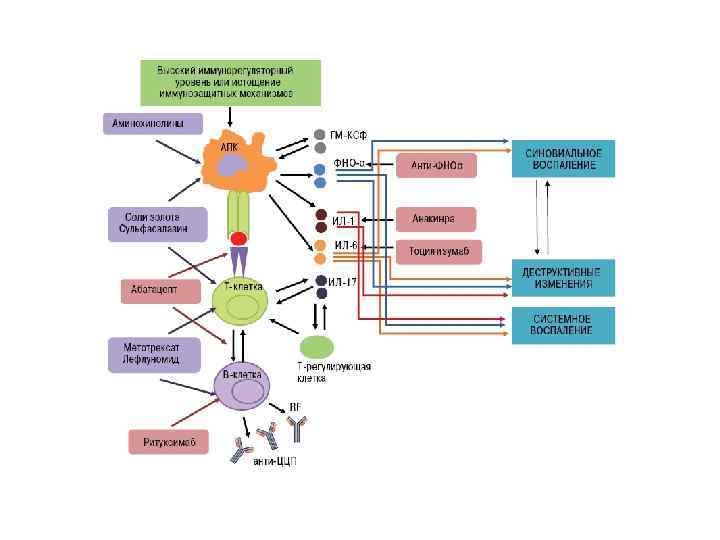 Антицитокиновая терапия • Инфликсимаб (ремикейд) – TNFα • Этанерсепт – TNFα- рецептор • Анакинра – антагонист IL-1β • При отсутствии эффекта на фоне лечения метотрексатом • Необходимость снижения дозы ГКС • Наличие противопоказаний к стандартной терапии