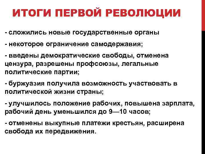ИТОГИ ПЕРВОЙ РЕВОЛЮЦИИ - сложились новые государственные органы - некоторое ограничение самодержавия; - введены демократические свободы, отменена цензура, разрешены профсоюзы, легальные политические партии; - буржуазия получила возможность участвовать в политической жизни страны; - улучшилось положение рабочих, повышена зарплата, рабочий день уменьшился до 9— 10 часов; - отменены выкупные платежи крестьян, расширена свобода их передвижения.