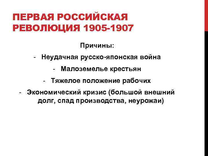 ПЕРВАЯ РОССИЙСКАЯ РЕВОЛЮЦИЯ 1905 -1907 Причины: - Неудачная русско-японская война - Малоземелье крестьян - Тяжелое положение рабочих - Экономический кризис (большой внешний долг, спад производства, неурожаи)