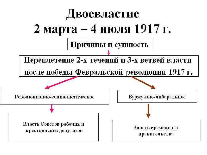 Название кризиса Председатель Состав правительства Причины кризиса Апрельский Г. Е. Львов Кадеты, прогрессисты, октябристы, беспартийные Нота Милюкова союзникам о продолжении участия в войне Июньский Г. Е. Львов Кадеты, эсеры, меньшевики Неудачное наступление на фронте. Разногласия в правительстве Июльский А. Ф. Керенский Кадеты, эсеры, меньшевики Агитация большевиков Августовский А. Ф. Керенский (Корниловщина) Кадеты, эсеры, меньшевики «Корниловский мятеж»