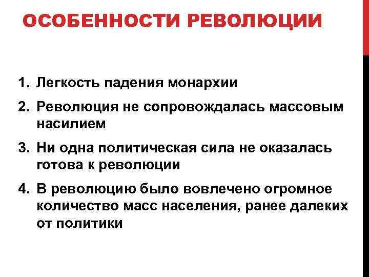 ОСОБЕННОСТИ РЕВОЛЮЦИИ 1. Легкость падения монархии 2. Революция не сопровождалась массовым насилием 3. Ни одна политическая сила не оказалась готова к революции 4. В революцию было вовлечено огромное количество масс населения, ранее далеких от политики