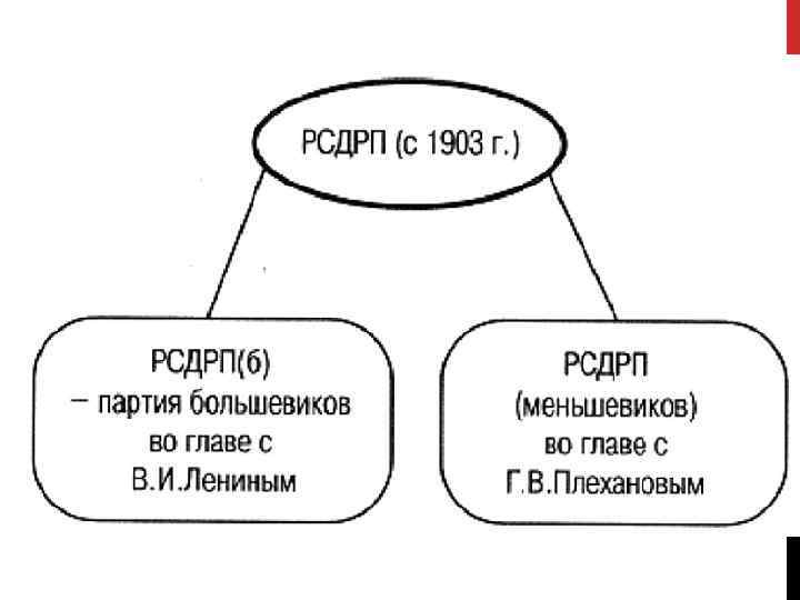 Партии Общее Различия Большевики Свержение самодержавия и установление демократической республики Основа – пролетариат, крестьяне. За программу максимум Меньшевики Основа – буржуазия, пролетариат, крестьяне За программу минимум