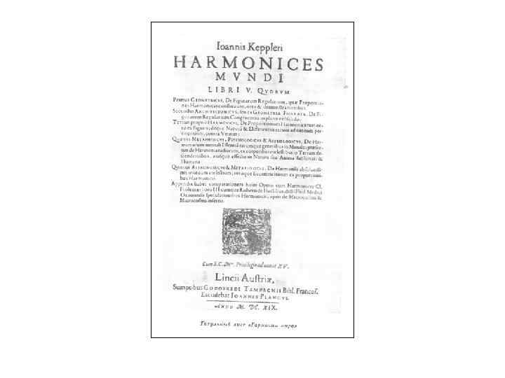 О гармонии мира • Существенную роль в открытиях Кеплера сыграло новое понимание им философских, наблюдательных и методологических основ науки и гибкое диалектическое их сочетание. Это относится, прежде всего, к идее мировой гармонии.
