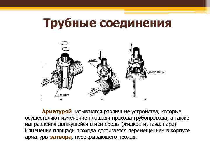 Трубные соединения Арматурой называются различные устройства, которые осуществляют изменение площади прохода трубопровода, а также направления движущейся в нем среды (жидкости, газа, пара). Изменение площади прохода достигается перемещением в корпусе арматуры затвора, перекрывающего проход.