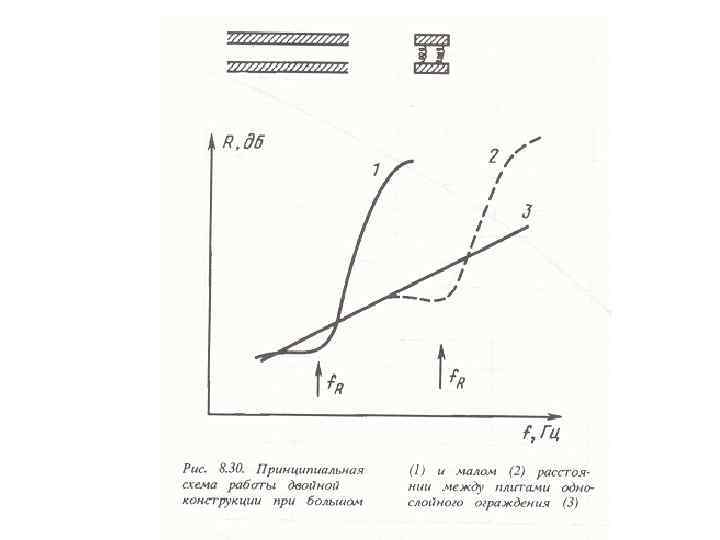 Резонансная частота Двойное ограждение с воздушным промежутком или слоем минваты Двойное ограждение с слоем пористого материала с жестким скелетом (пенопласт, фибролит) - поверхностные плотности обшивок - толщина воздушного или звукоизоляционного слоя - динамический модуль упругости звукоизоляционного слоя