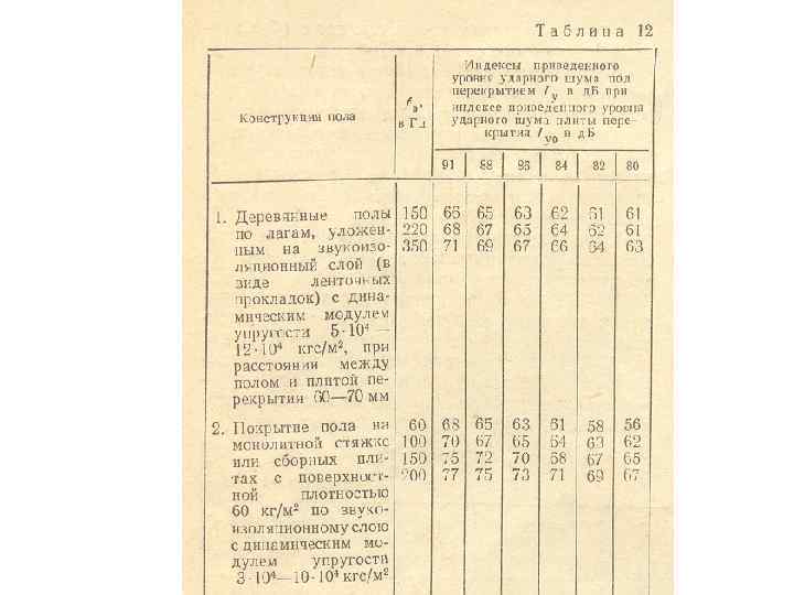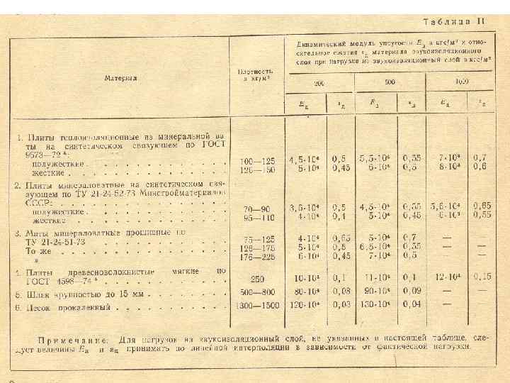 Резонансная частота - поверхностная плотность несущей плиты перекрытия - поверхностная плотность конструкции пола без звукоизоляционного слоя - динамический модуль упругости звукоизоляционного слоя - толщина звукоизоляционного слоя под нагрузкой, т. е. в обжатом состоянии - относительное сжатие материала звукоизоляционного слоя