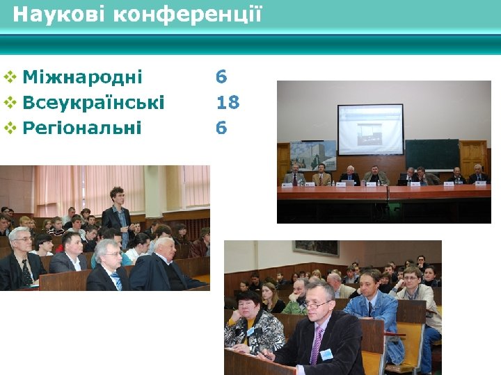 Міжнародні заходи v ІV міжнародний симпозіум «Література - театр - суспільство» ; v V міжнародна конференція молодих науковців «Історична наука на початку ХХІ століття: проблеми, минуле, сучасність, перспективи» ; v VIІ міжнародна науково-практична конференція «ІКТ в освіті, дослідженнях та індустріальних додатках: інтеграція, гармонізація та трансфер знань» ; v Міжнародна науково-практична конференція «Актуальні проблеми дошкільної та початкової освіти» ; v VІI міжнародна наукова конференція «Фальцфейнівські читання» ; v Міжнародна науково-практична конференція «Розвиток правової держави і громадянського суспільства в Україні: проблеми, теорії і практики» .