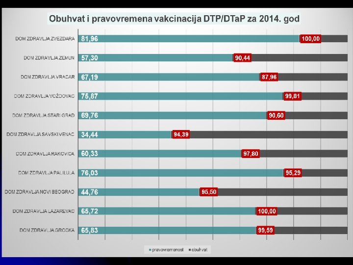 >95% 90 -95% 80 -90% <80% USPEH U PROCENTIMA % 2010 2011 2012 2013 2014 Polio vakcinacija 98, 6 98, 3 95, 23 98, 23 94, 40 I Polio revakcinacija 94, 1 93, 2 91, 75 91, 06 83, 25 II Polio revakcinacija 98, 4 98, 5 93, 89 94, 45 III Polio revakcinacija 95, 5 94, 6 56, 15 92, 35 83, 00 DTP vakcinacija 98, 7 98, 3 96, 28 98, 27 94, 52 DTP revakcinacija 93, 6 93, 0 91, 91 91, 41 82, 95 DT revakcinacija 98, 7 98, 5 95, 08 93, 86 93, 49 d. T revakcinacija 93, 9 94, 3 60, 07 91, 73 86, 61 ММR vakcinacija 94, 1 94, 2 91, 93 88, 37 80, 25 ММR revakcinacija u 7. god. 98, 7 98, 0 95, 02 80, 40 89, 24 Hi. B vakcinacija 99, 4 96, 2 93, 26 97, 01 96, 08 Hepatitis B vakcinacija u 1. god. 95, 3 97, 7 95, 25 93, 74 92, 43 Hepatitis B vakcinacija u 12. god. 61, 5 82, 1 82, 07 70, 20 68, 04 VAKCINA