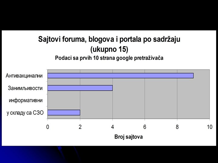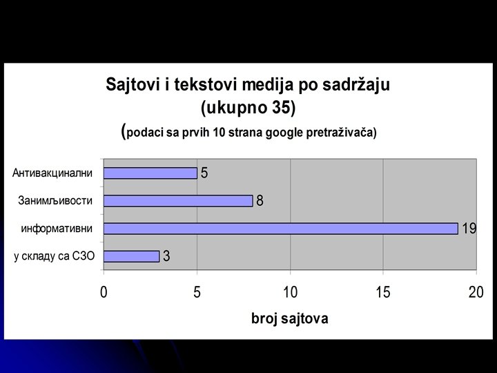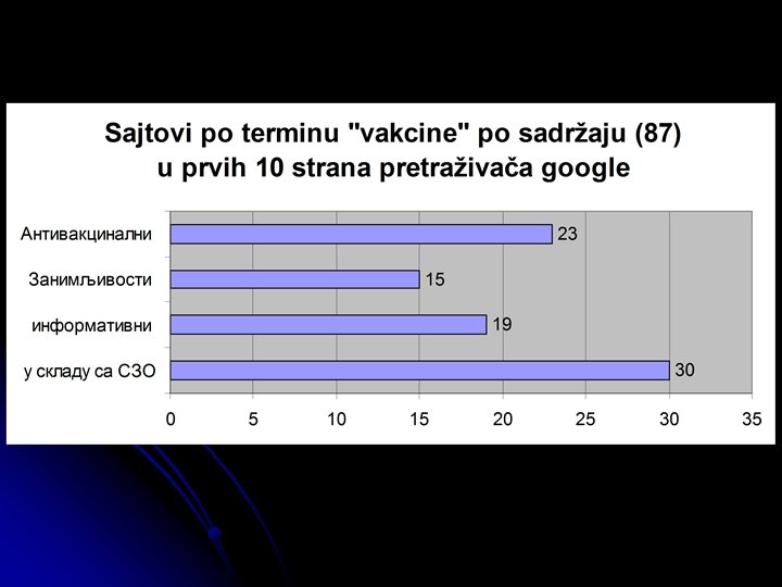 Istraživanje stavova roditelja o imunizaciji l Roditelji se zbunjuju u toku rasprava o imunizacijama. Većina je bez osnovnog znanja o tome kako vakcine funkcionišu i smatraju da standardne informacije nisu od pomoći l Na pitanje koji će izvor konsultovati za više informacija 33% je reklo da će pitati svog lekara, a 70% je reklo da će pogledati na internetu l Na pitanje da objasni svoj izbor 70% navodi pogodnost, a čak 17% pouzdanost Na eksplicitno pitanje da li bi koristili internet za pronalaženje informacija 93% odgovara potvrdno Downs, et al. Parents’ vaccination comprehension and decisions. Vaccine 2008; 26: 1595 -1607.