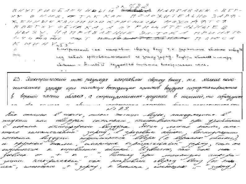 Задание № 22 из демоверсии 2016 № 22 Как направлен (сверху вниз или снизу вверх) электрическии ток разряда внутриоблачнои молнии при механизме электризации, описанном в тексте? Ответ поясните. Вариант возможного ответа 1. Сверху вниз. 2. Согласно описанию в тексте верхняя часть облака содержит преимущественно мелкие частицы, имеющие избыточныи положительныи заряд. Внизу облака накапливаются крупные частицы, имеющие избыточныи отрицательныи заряд. За направление электрического тока принимается направление движения в электрическом поле, создаваемом током, свободнои положительно заряженнои частицы.
