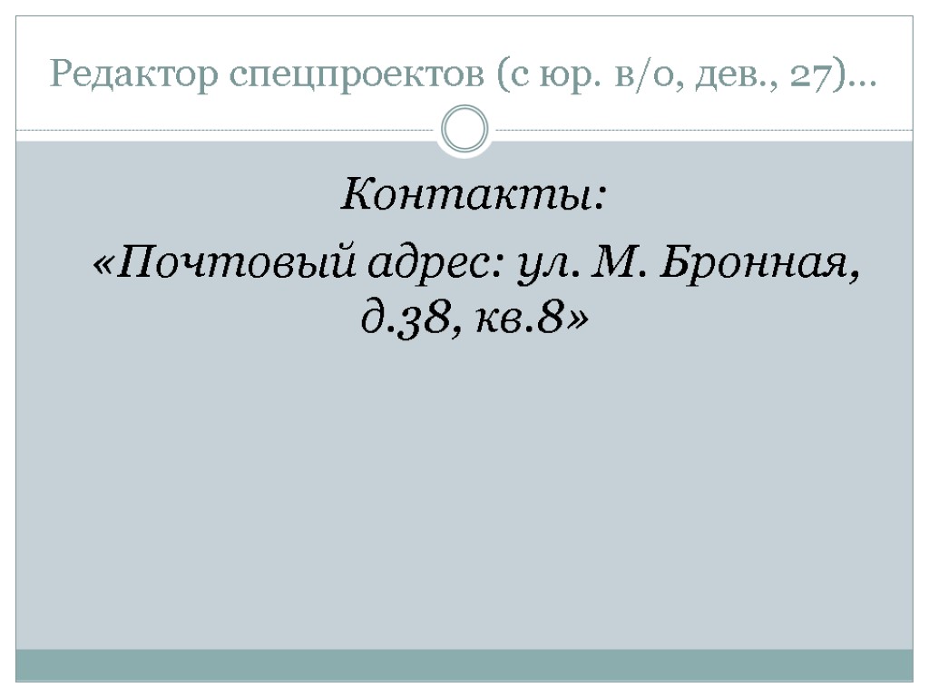Редактор спецпроектов (с юр. в/о, дев., 27)… Контакты: «Почтовый адрес: ул. М. Бронная, д.38, кв.8»
