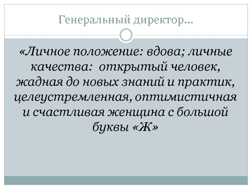 Генеральный директор… «Личное положение: вдова; личные качества: открытый человек, жадная до новых знаний и практик, целeустремленная, оптимистичная и счастливая женщина с большой буквы «Ж»