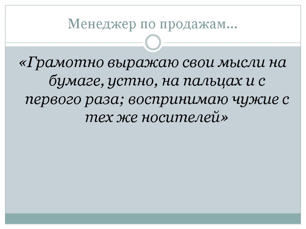 Менеджер по продажам… «Грамотно выражаю свои мысли на бумаге, устно, на пальцах и с первого раза; воспринимаю чужие с тех же носителей»