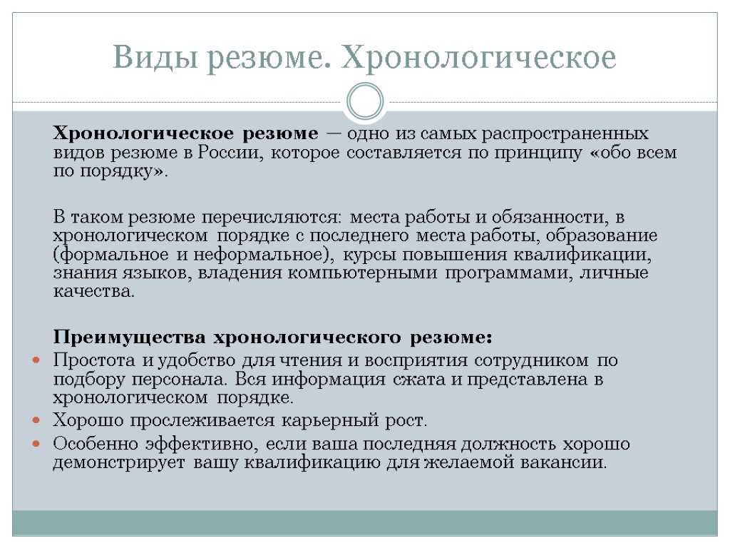 Виды резюме. Хронологическое Хронологическое резюме — одно из самых распространенных видов резюме в России, которое составляется по принципу «обо всем по порядку». В таком резюме перечисляются: места работы и обязанности, в хронологическом порядке с последнего места работы, образование (формальное и неформальное), курсы повышения квалификации, знания языков, владения компьютерными программами, личные качества. Преимущества хронологического резюме: Простота и удобство для чтения и восприятия сотрудником по подбору персонала. Вся информация сжата и представлена в хронологическом порядке. Хорошо прослеживается карьерный рост. Особенно эффективно, если ваша последняя должность хорошо демонстрирует вашу квалификацию для желаемой вакансии.