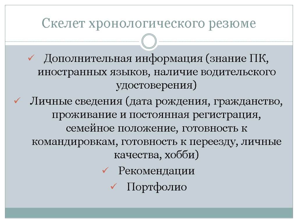 Скелет хронологического резюме Дополнительная информация (знание ПК, иностранных языков, наличие водительского удостоверения) Личные сведения (дата рождения, гражданство, проживание и постоянная регистрация, семейное положение, готовность к командировкам, готовность к переезду, личные качества, хобби) Рекомендации Портфолио