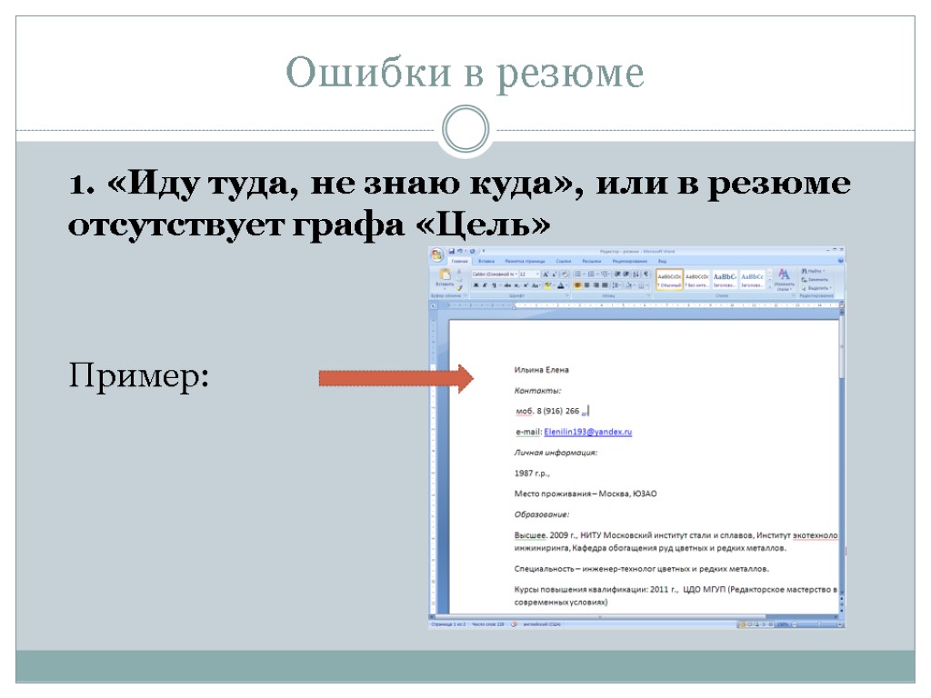 Ошибки в резюме 1. «Иду туда, не знаю куда», или в резюме отсутствует графа «Цель» Пример:
