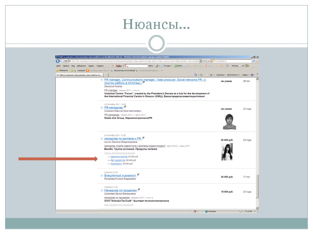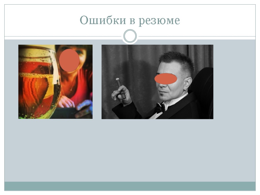 Ошибки в резюме 9. «Неудачная» фотография (в купальнике на турецком курорте, в помятом виде в кабаке и др.), если она нужна вообще Менеджер по рекламе (24); журналист (21); редактор новостей, продюсер (24)